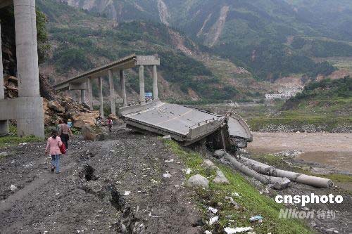 四川大地震,都江堰到汶川縣映秀鎮沿線民房和交通受損嚴重,許多受困的居民紛紛離家趕往安全地點,也有許多居民想回家看望地震區的親人。圖為都汶高速的百花大橋20米左右被地震震垮,多處橋墩受損壞。中新社發 黃榮 攝