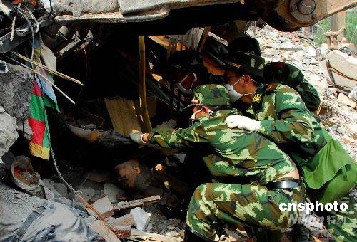 5月15日,在四川省綿竹市漢旺鎮地震重災區,數千名武警、消防官兵與時間賽跑,盡可能地搶救每一名被困的災民。中新社發 陳進 攝