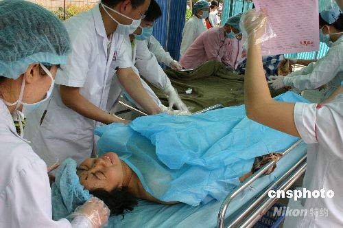 5月16日,成都華西醫院,來自汶川映秀鎮、什邡、綿竹等災區的重癥傷員不斷轉運而至,醫護人員和志愿者對重癥傷員進行精心的醫護和救治。中新社發 楊杰 攝
