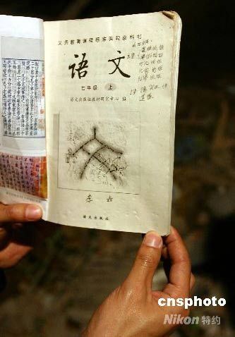 初三學生孫丹梅的父親仍在現場守候,他不停地翻動那些在廢墟中發現的書本,查看里面孩子的名字和班級。
