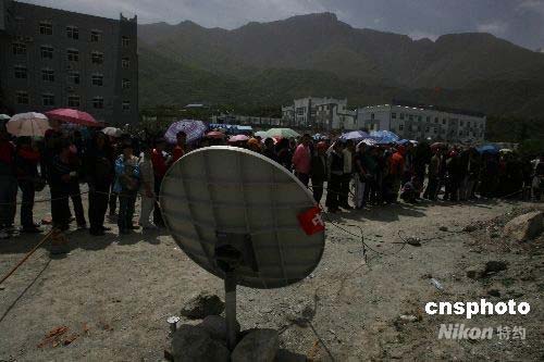 四川省茂縣在大地震后成為通訊和電力完全中斷的“孤島”,5月16日開通第一臺衛星電話后,晝夜供百姓向外界報平安,上千人排隊等候一分鐘的寶貴通話。中新社發 賈國榮 攝