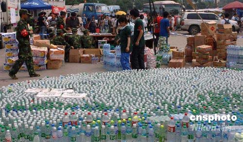5月中旬, 來自四面八方的抗震救災物資物品正在源源不斷地運往四川地震災區。都江堰市一個災民聚集點里,一度趨于緊張的飲用水供應已經出現好轉,各種不同品牌的瓶裝水被排列成地震災區的巨大圖形,時刻警醒著人們。中新社發 鄒憲 攝