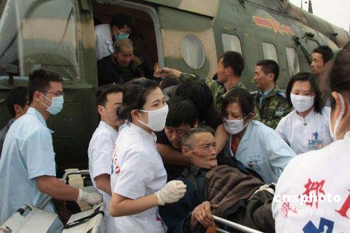 連日來,中國空軍連續(xù)出動軍用直升機到四川重災(zāi)區(qū)緊急搶運危重傷員,及時送到成都進(jìn)行救治,為挽救幸存者生命贏得時間。圖為5月15日,空軍航空兵某搜救團轉(zhuǎn)移傷員的情景。中新社發(fā) 譚超 攝