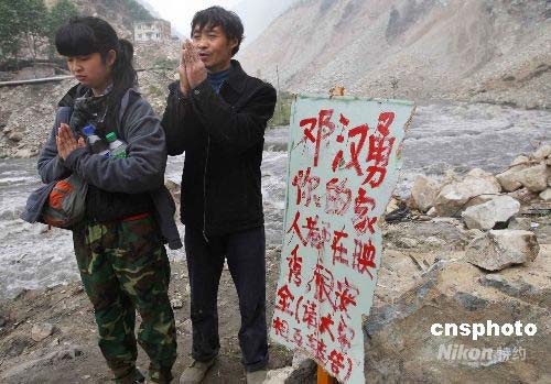 5月17日上午,在四川省汶川大地震中幸存的49歲映秀鎮頭道村農民鄧云祥和女兒鄧小琴,在通往家鄉的必經之地插上告示牌,企望失蹤的兒子鄧漢勇能夠平安歸來。鄧云祥的家鄉在映秀鎮通往臥龍大熊貓保護區的303國道8公里處,至今這條通往臥龍的道路幾乎全線被山體滑坡所覆蓋。中新社發 任晨鳴 攝
