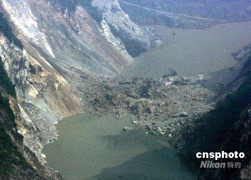 四川省汶川大地震災區五月十七日頻繁發生余震,岷江兩岸多處被塌方形成危險的堰塞湖。中新社發 賈國榮 攝