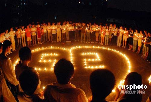 5月16日晚,大學生們手捧蠟燭組成“愛心512”的圖案,為地震災區(qū)祈禱。當晚,廣西工學院信計042班大學生開展為地震災區(qū)祈福活動,引來了300多名大學生自發(fā)參與。中新社發(fā) 小木木 攝