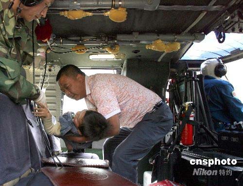 一名在五月十二日汶川大地震中受傷嚴重的茂縣小男孩,十六日終于被送上成都軍區(qū)陸軍航空兵的直升飛機上時,小男孩情不自禁地模著解放軍的手。中新社發(fā) 賈國榮 攝