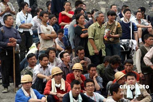 5月17日,四川汶川縣漩口鎮地震災民等待解放軍官兵用沖鋒舟運送他們到都江堰。中新社發 張雷 攝