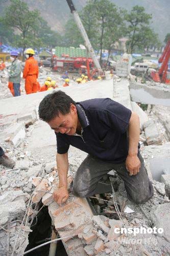 5月17日中午12時30分左右,北川中學高二八班17歲的學生熊文碧父親特地從浙江溫州趕回,找到女兒上課的教室后,跪尋女兒身影。中新社發 劉震 攝