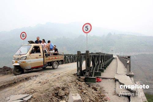 5月17日,通往汶川的壽江大橋橋頭塌陷,成都軍區某舟橋團及時搭起橋上橋,方便災民通往。中新社發 張雷 攝