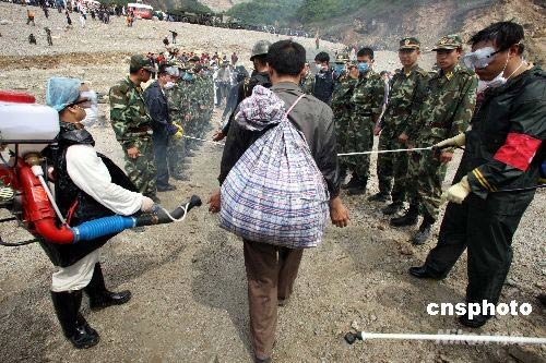 5月18日,醫療人員在都江堰渡口為從地震災區轉移來的民眾消毒防疫。中新社發 盛佳鵬 攝