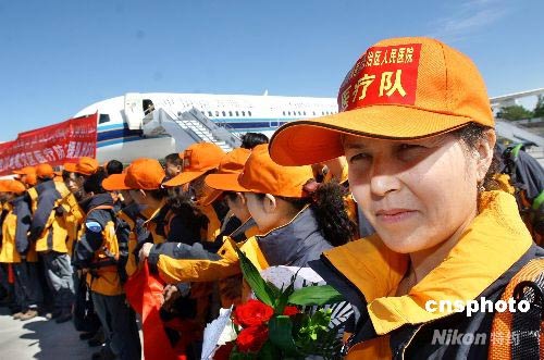 5月18日下午,由新疆多家醫療機構醫護專家組成首批抗震救災醫療防病救援隊從新疆烏魯木齊國際機場乘專機前往四川汶川地震災區實施醫療救助和疫情防御工作,同時30噸救援所需的藥品和物資也隨救援隊一同被運往地震災區。據了解,新疆首批抗震救災醫療防病救援隊共計90人,由維、漢、哈、回等各族醫護工作者組成,其中女性24名。當日上午7輛救援工作車已從烏魯木齊出發,趕向四川災區,預計54小時即可到達災區。中新社發 劉新 攝