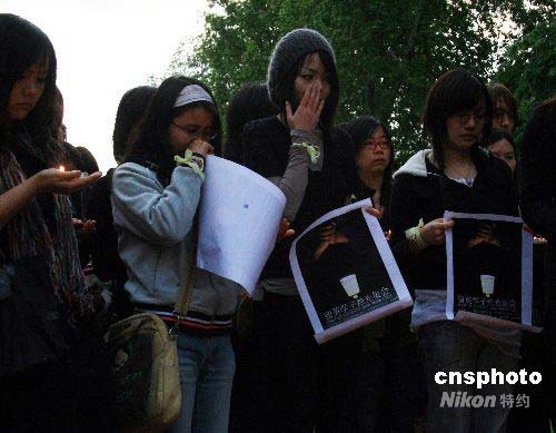 當地時間18日晚,數百名留英中國學生和學者聚集到倫敦大學亞非學院,在燭光中為四川地震災區的人民祈禱與祝福。圖為悼念死難者時,手捧蠟燭的留學生們潸然淚下。中新社發 李鵬 攝