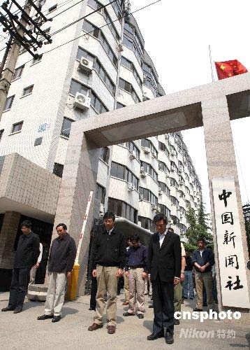 5月19日,中國首個全國哀悼日,14點28分,北京全城響起警報聲,中國新聞社總社全體值班員工在社領導率領下,在該社大門口列隊為四川汶川大地震中遇難同胞默哀三分鐘。中新社發 任海霞 攝