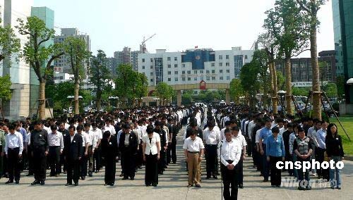 5月19日, 揚(yáng)州市委、市人大、市政府、市政協(xié),各區(qū)委、區(qū)政府及市直有關(guān)部門(mén)下半旗,沉痛哀悼四川地震遇難同胞。14時(shí)28分起,全市人民默哀3分鐘,汽車(chē)、火車(chē)、船舶鳴笛,各防空警報(bào)點(diǎn)防空警報(bào)鳴響。在全國(guó)哀悼日期間,停止公共娛樂(lè)活動(dòng),開(kāi)展一系列的哀悼活動(dòng),以表哀思。截至18日晚,揚(yáng)州市募集賑災(zāi)捐款突破千萬(wàn)元人民幣。圖為揚(yáng)州市政府大院全體工作人員胸佩白花集體列隊(duì)默哀。中新社發(fā) 崔佳明 攝