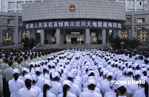 5月19日14點28分,安徽省在黃山市政務廣場舉行默哀儀式。安徽省委書記王金山、省長王三運等政府官員與三千余民眾集體為四川地震災區(qū)死難同胞默哀3分鐘。中新社發(fā) 張婭子 攝