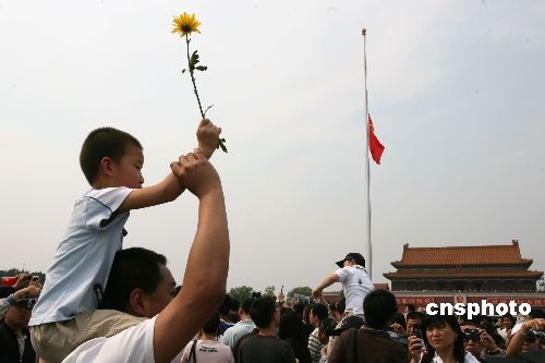 5月19日14時28分,數(shù)萬民眾在北京天安門廣場為四川汶川大地震遇難者默哀,一名兒童騎在父親肩頭高舉黃菊花表達哀思。5月19日至21日為中國全國哀悼日。中新社發(fā) 王瑤 攝