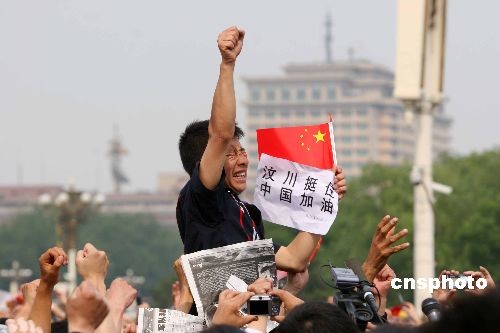 5月19日14時28分,北京天安門廣場上的民眾為四川汶川大地震遇難者默哀3分鐘。一位來自四川的男子高舉右手為災區加油。中新社發 富田 攝