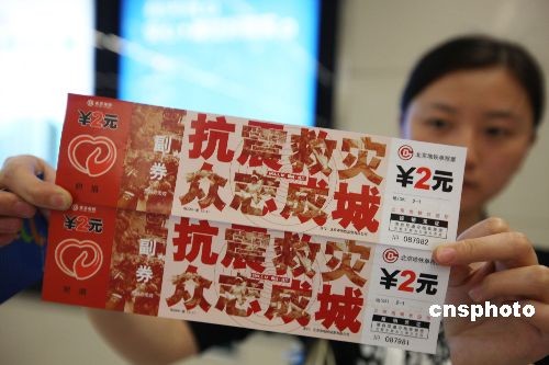 5月18日,北京地鐵首次發(fā)行的“特種”愛(ài)心附捐車票出現(xiàn)在北京地鐵所有車站售票臺(tái),這套附帶為地震災(zāi)區(qū)捐款獻(xiàn)愛(ài)心的文化車票受到了市民的青睞,北京地鐵公司將把附捐的40萬(wàn)元愛(ài)心款全部轉(zhuǎn)交中國(guó)紅十字會(huì)。這套愛(ài)心附捐車票發(fā)行總量為10萬(wàn)套,每張車票售價(jià)4元,其中包括2元捐給災(zāi)區(qū)的款項(xiàng)。中新社發(fā) 老羅 攝