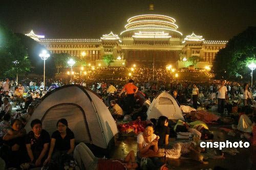5月20日凌晨,重慶人民廣場內,大批當?shù)厥忻裨诖舜罱◣づ襁^夜。19日晚21時30分許,重慶市人民政府發(fā)布信息稱,19日至20日,在汶川震區(qū)附近有可能發(fā)生6至7級余震,重慶各地將會有明顯震感。并提醒廣大市民注意安全,按防震知識做好防范工作,注意相互幫助、維護公共秩序。信息發(fā)布后,大批當?shù)厥忻耖_始聚集廣場、平地等開闊地帶過夜。中新社發(fā) 郭晉嘉 攝
