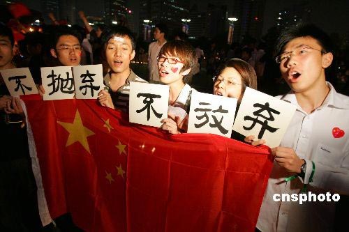 5月19日晚,數千名上海市民自發前往人民廣場,點亮十萬支蠟燭為四川地震遇難者祈福。眾多青年在現場高唱國歌,為中國加油,為四川加油。中新社發 湯彥俊 攝