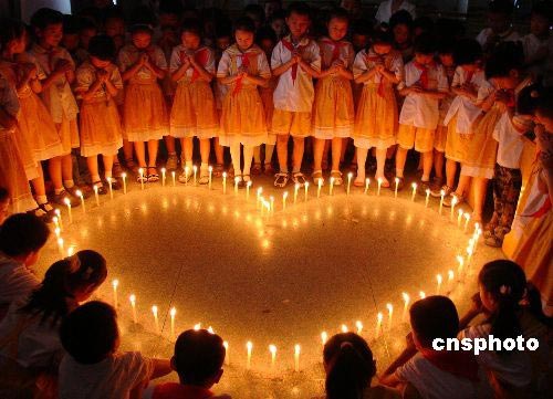 5月19日,小學生們點燃燭光,默默祈禱。當日,河南許昌古槐街小學舉行“點燃紅燭、為災區(qū)人民祈福”活動,學生們點燃燭光,默默為四川地震災區(qū)人民祈禱祝福。中新社發(fā) 牛書培 攝