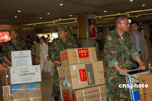5月19日深夜,部隊(duì)官兵攜帶救援藥品到達(dá)四川成都雙流國際機(jī)場,為救治四川汶川大地震受傷人員添力。