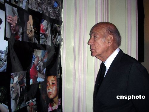 五月二十日上午,法國前總統德斯坦來到中國駐法國大使館,向四川大地震遇難者表示哀悼。他用中文在吊唁簿上一筆一劃地寫下了“深切哀悼四川死難者”。中新社發 吳衛中 攝