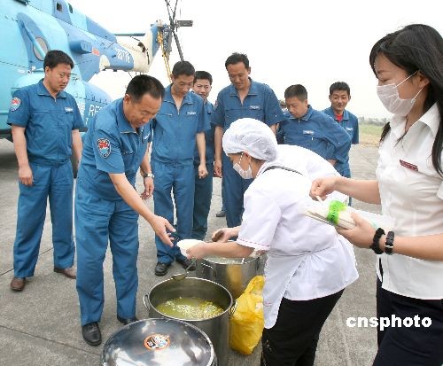 5月20日,成都市某企業(yè)職工給戰(zhàn)斗在抗震救災(zāi)一線的南空某團官兵送在熱氣騰騰的老鴨湯。