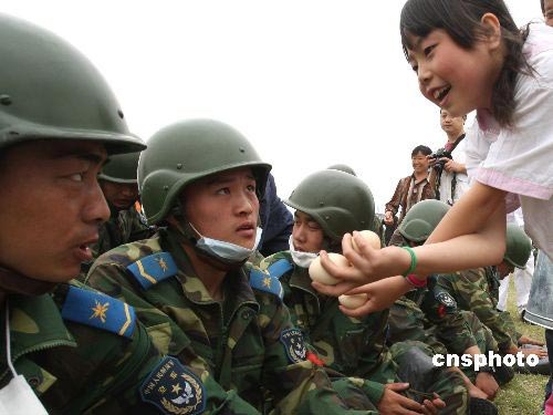 5月20日,四川德陽(yáng)地區(qū)受災(zāi)民眾手捧家中的雞蛋慰問解放軍官兵。中新社發(fā) 趙振清 攝