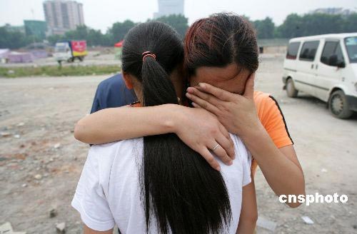 5月20日中午12時20分,在北川中學學生臨時安置點,李春榕找到了尋找了六天的姐姐的女兒——北川中學初一六班的楊曉丹,在得知父母已不在人世時,楊曉丹與小姨相擁而泣。中新社發 劉震 攝