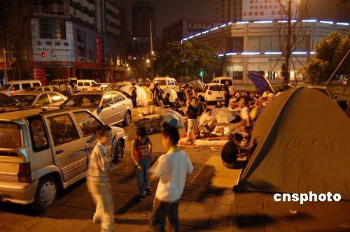 5月20日晚上,四川成都市民再次紛紛走出家門來到空曠地帶,或者睡在車上,或者在帳篷中,躲避余震。五月十九日晚間官方發(fā)布四川汶川大地震兩天內(nèi)可能發(fā)生六至七級余震的消息,當晚成都市民紛紛在街頭避震。中新社發(fā) 劉萬強 攝