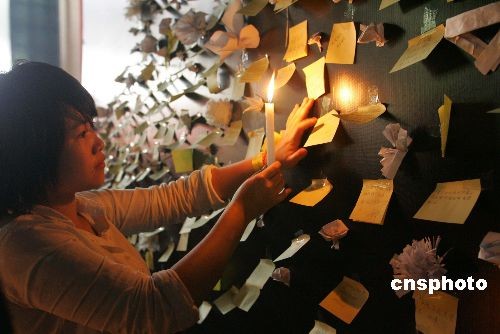 在五月十九日到二十一日為期三天的全國(guó)哀悼日里,福州寶龍廣場(chǎng)上豎立的兩面以黑色為背景的哀思?jí)η埃S多市民紛紛駐足,悼念四川汶川特大地震遇難同胞。圖為哀悼墻上貼滿人們寫下祝福的紙片、紙花,寄托哀思。中新社發(fā) 小小 攝