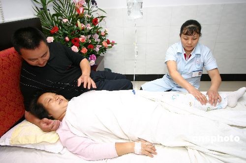 5月21日,護(hù)士給汶川來的產(chǎn)婦陳梅談心。17日上午10時(shí)許,重慶市永川區(qū)婦幼保健院順利地把來自四川省汶川地震災(zāi)區(qū)的陳梅產(chǎn)婦生下一男嬰,那是她經(jīng)過10小時(shí),徒步32公里,從汶川震區(qū)撤離出來,才換來的小生命。嬰兒從出生以來,醫(yī)院讓小生命住進(jìn)嬰兒培養(yǎng)箱,以促進(jìn)小生命的身體健康。中新社發(fā) 陳仕川 攝