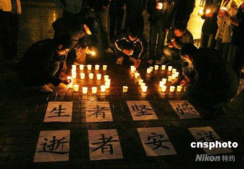 5月21日晚上,沈陽市下起了大雨,但大雨沒有擋住市民哀悼的心情,大家自發的來到沈陽市政府廣場用燭光等形式哀悼四川汶川地震遇難同胞并高呼“汶川加油,四川雄起,中國加油”等口號。中新社發 黃金昆 攝