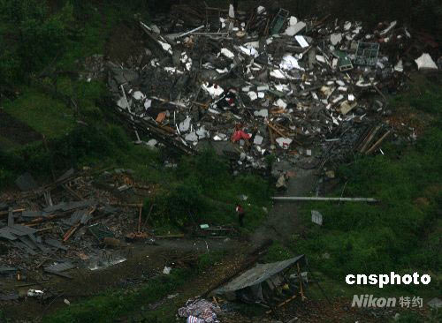 五月二十一日,汶川大地震第十天,從空中可見一位偏遠(yuǎn)山村的幸存者回到地震倒塌的家園,面對(duì)廢墟。中新社發(fā) 賈國(guó)榮 攝
