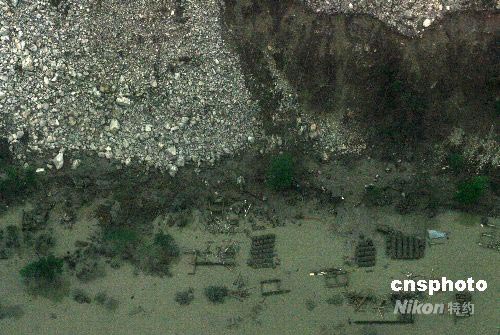 五月二十二日,汶川大地震第十一天,空中可見大山崩塌泥石堵塞河道淹沒一座村莊。中新社發 賈國榮 攝