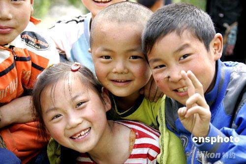 5月22日,四川汶川綿池鎮災區的兒童面對鏡頭露出久違笑臉。連日來,受地震影響的受災民眾在武警官兵等熱心人士的共同努力下,已陸續得到妥善安置。中新社發 賁道春 攝