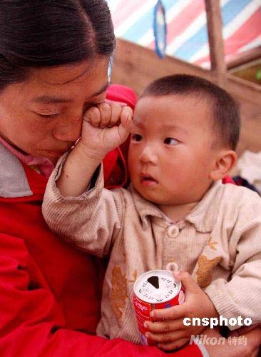5月22日,在汶川縣映秀鎮(zhèn)災民帳篷內(nèi)37歲的羅后芬為在汶川地震中失去的12歲大兒子王光杰而淚流滿面。不到兩歲的小兒子王光昊似乎看懂了媽媽的悲痛,不停地為媽媽擦拭眼淚。中新社發(fā) 曾憲平 攝