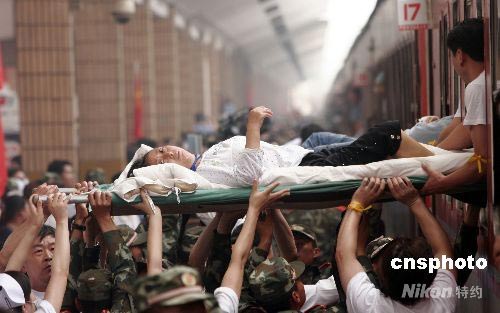 5月24日,運載四川綿陽到武漢漢口的264名地震災區傷員轉運專列到達漢口站。他們將在協和、同濟、陸軍總醫院、人民醫院等醫院接受治療。中新社發 攝記 攝