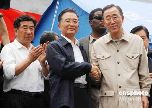 5月24日,中國國務院總理溫家寶與聯合國秘書長潘基文在四川汶川映秀鎮會面,并回答了中外記者的提問;秘書長潘基文表示,聯合國與世界各國人民將和中國人民站在一起,共同戰勝地震災害。中新社發 陳文 攝