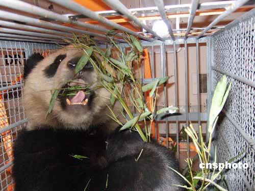 5月24日,8只奧運大熊貓“獨享”世界最大最先進貨機進京。這次運送奧運熊貓的專機,是南航完成運送救災物資任務后,安排的目前世界上最大、最先進的波音747-400F型貨機。這架飛機內外將進行全面的清洗和消毒,為大熊貓配備純凈水和新鮮嫩竹葉等機上美食。貨機主艙溫度控制在8℃至14℃,使大熊貓在機艙內依然能感受到與四川臥龍保護區一樣的溫度。圖為進京大熊貓在恒溫專機上用餐。中新社發 林宇定 攝