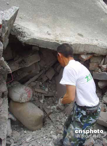 四川汶川大地震幾乎將安縣永安鎮(zhèn)躍進村夷為平地,地震后,當?shù)卮迕穹e極展開生產(chǎn)自救,5月24日上午,村民付作興在自家房屋的廢墟中“搶救”糧食,希望以此減輕政府負擔。中新社發(fā) 霍潺 攝