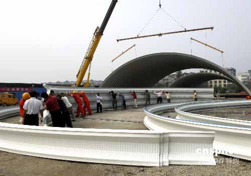24日,由成都市新都區組織上千名工人,投資4000萬元,在都江堰市觀鳳小區為受災群眾援建的安置房落成,2000受災群眾找到了新家。精心的設計,人性化的布置,受到了當地受災群眾的拍手稱贊。圖為工人們正在搭建鋼制拱型餐廳。中新社發 劉亮 攝
