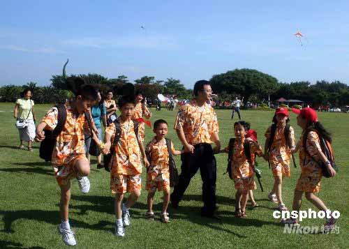 二十五日,海口。參加“為災區孩子療傷——愛心海南游”的九名來自四川綿陽安縣、都江堰地區的地震受災兒童,相聚在海口萬綠園,開始他們為期三天兩晚的海南之旅。此次參加活動的孩子都是暫時無家可歸、無學可上,而到海南來投親靠友的。圖為在心理輔導志愿者的陪伴下,來自綿陽安縣的孩子陶醉在游戲中。本次活動由《南國都市報》和海南中國青年旅行社聯合發起。中新社發 高天胤 攝