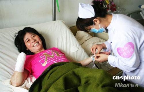 5月26日,在沈陽遼寧省人民醫院接受治療的汶川地震傷員微笑面對鏡頭,盡顯堅強。目前,沈陽市已有9家醫院共接受144名汶川地震傷員治療。中新社發 劉寶成 攝