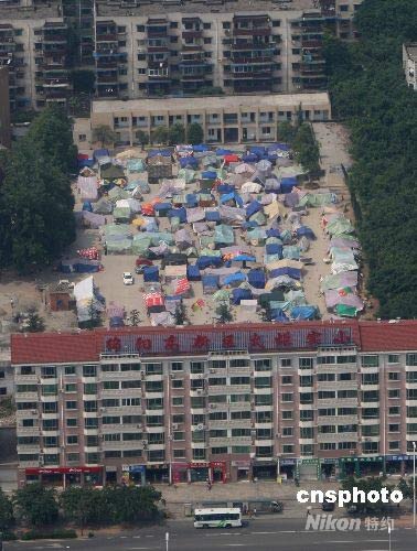 由于天氣的不穩定和余震的不斷發生,眾多綿陽市民還在地震棚里生活。中新社發 趙振清 攝