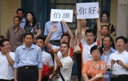 江蘇青年干部管理學院的大二學生在人群中分別打著“伯雄”“你好”標語。