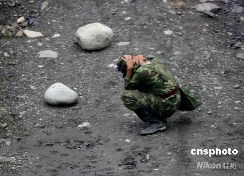 汶川大地震發生十五天以來余震不斷,一位搶險的士兵突遇滑坡,果斷蹲地減少人體面積,同時用雙手牢牢保護頭部,終于化險為夷。中新社發 賈國榮 攝