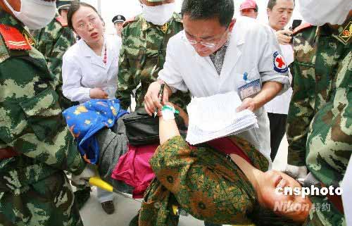 5月27日,蘇州醫護人員與武警在碩放機場迎接剛從四川震區轉運來的傷員。當天,首批34名四川地震災區傷員被接運至蘇州接受治療。據了解,當晚蘇州還將接受兩個航班的70多名來自四川震區轉運治療的傷員。中新社發 蘇秀 攝